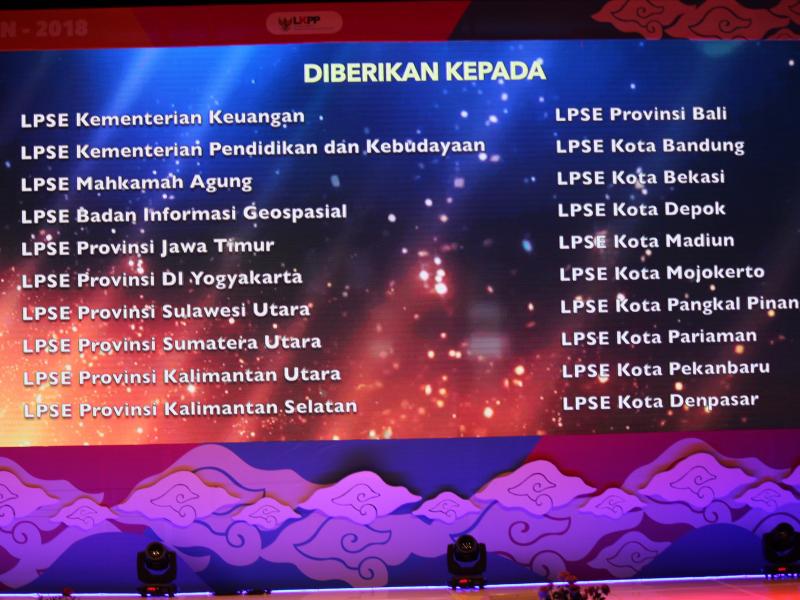 Penghargaan tersebut diberikan secara langsung oleh Kepala LKPP Agus Prabowo kepada 49 LPSE se-Indonesia untuk kategori tersebut dan diterima oleh masing – masing perwakilan Kementerian/ Lembaga/ Pemerintah Provinsi/ Kabupaten/ Kota. Selain itu juga LKPP memberikan penghargaan untuk kategori lainnya kepada UKPBJ yang berprestasi.