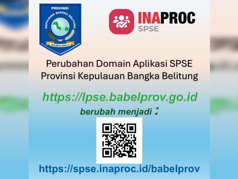 Sehubungan dengan percepatan transformasi digital pengadaan barang/jasa pemerintah yang sedang dilaksanakan oleh Lembaga Kebijakan Pengadaan Barang/Jasa Pemerintah (LKPP) bersama PT. Telkom Indonesia (Persero) Tbk., bersama ini kami informasikan bahwa alamat domain Aplikasi Sistem Pengadaan Secara Elektronik (SPSE) Provinsi Kepulauan Bangka Belitung telah mengalami perubahan.